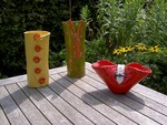 2002Deze 3 felgekleurde vazen hebben als thema sluitingen: een ritssluinging, knopen en een gesp.